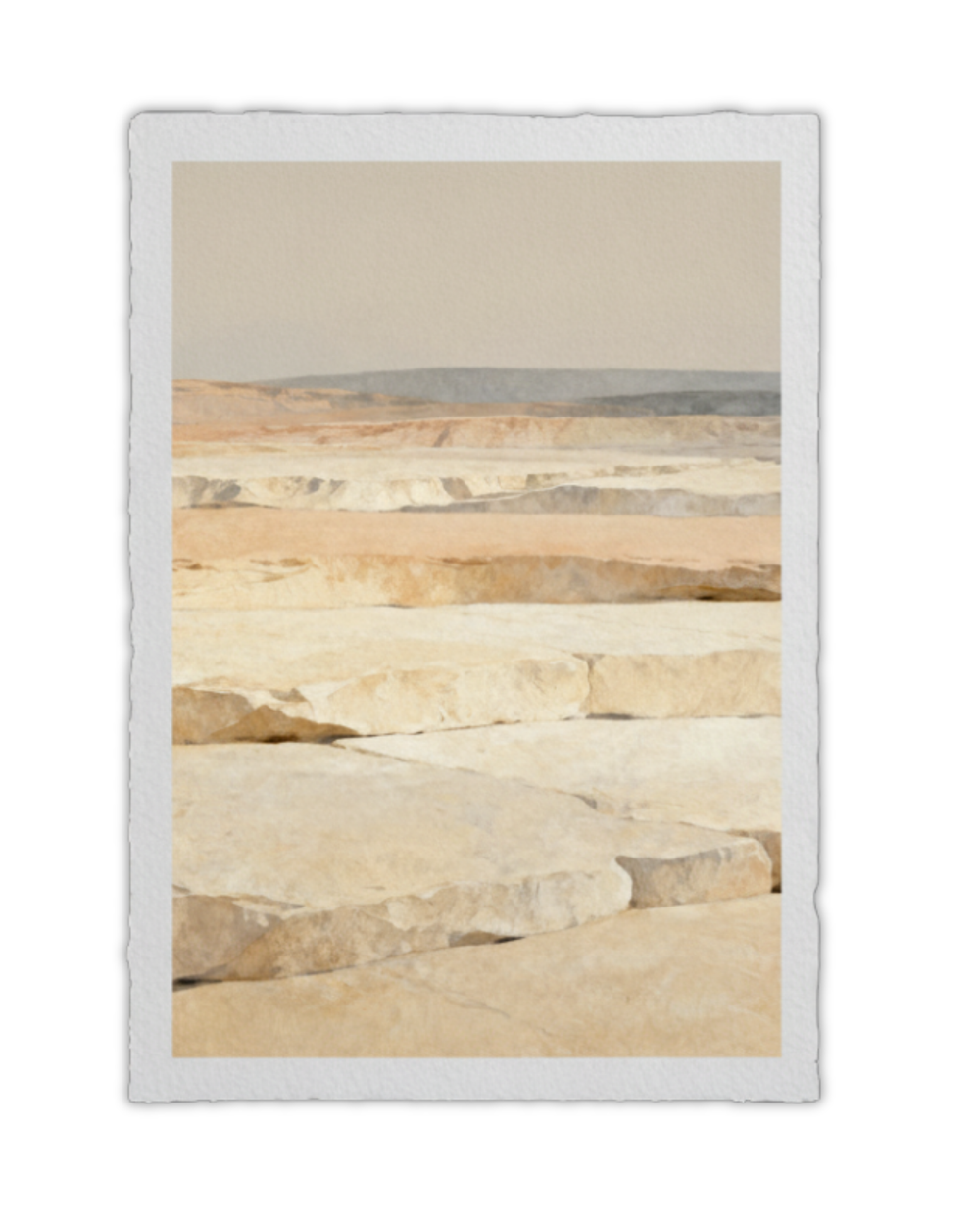 The tones are muted and steady, inspired by stone, earth, and distant horizons. Nothing pulls the eye too quickly. The surface feels layered and grounded, like a landscape reduced to its most essential forms.