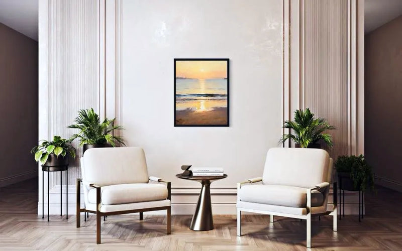 The horizon glows softly as gold tones move across the surface of the sea. The ocean feels calm and steady, but the light carries warmth, reflection, and depth. It is not a sunset scene meant to impress. It is a quiet shift in tone that changes how the entire space feels.
