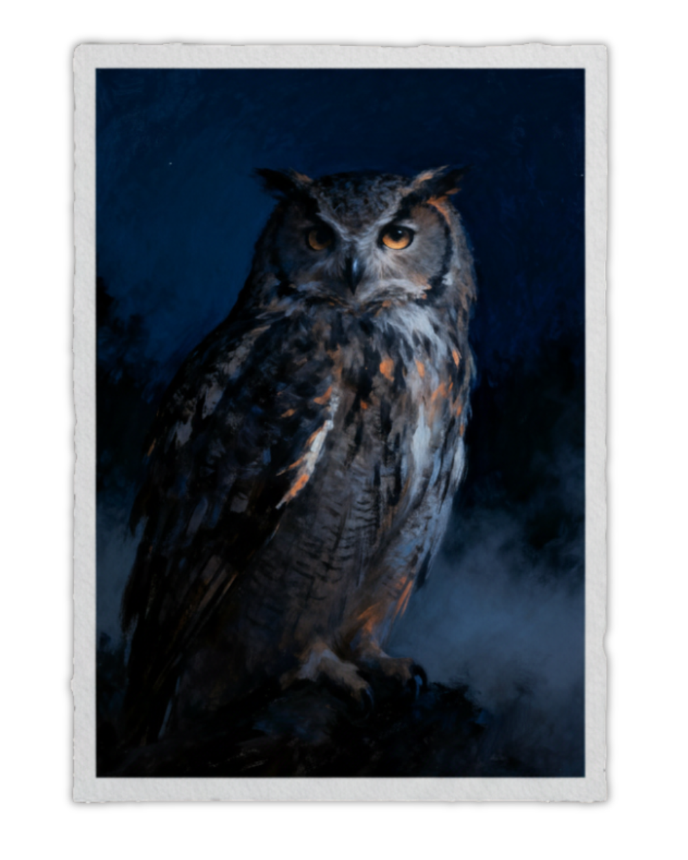 The owl watches from the dark, steady and unmoving. There is no urgency in its posture. No display of power. Just awareness. The kind that comes from experience rather than force.