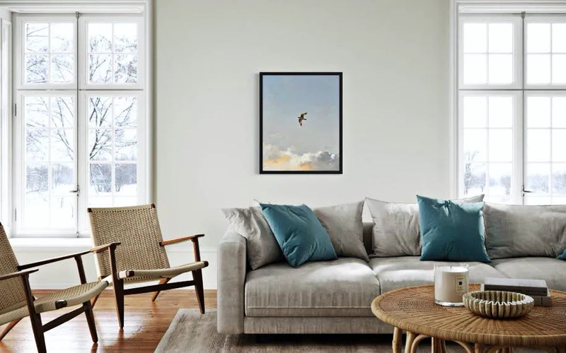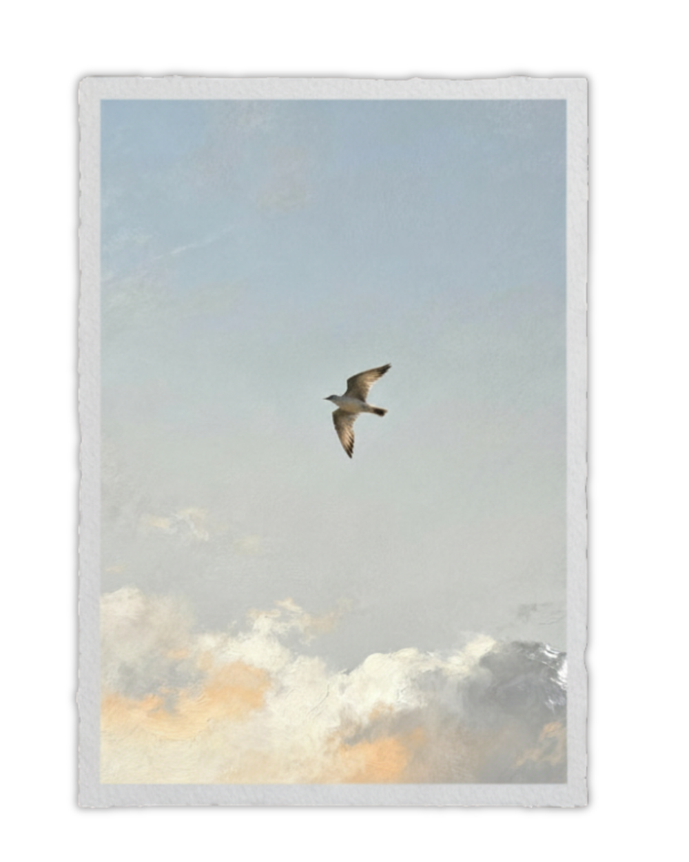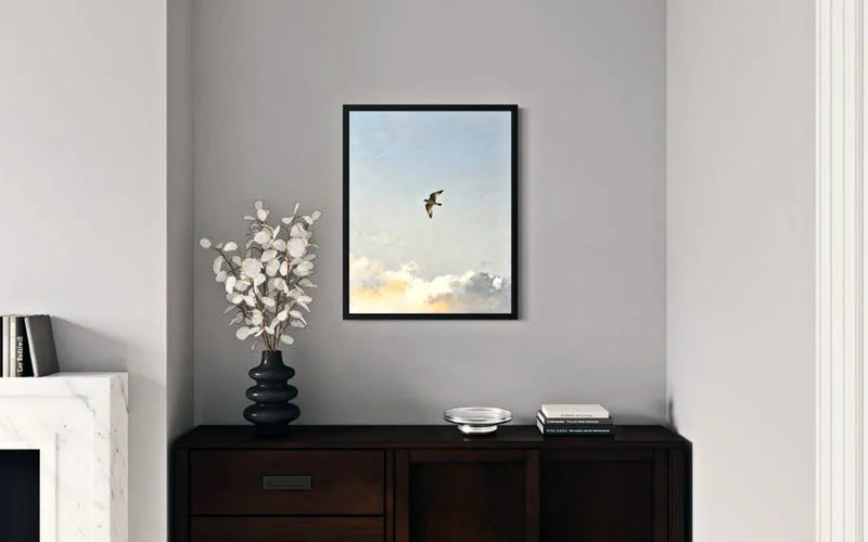 The bird is perched, alert, and observant. Nothing is rushed. The sky around it feels open and expansive, giving the sense that the world is wide but calm. This piece is not about flight. It is about awareness.