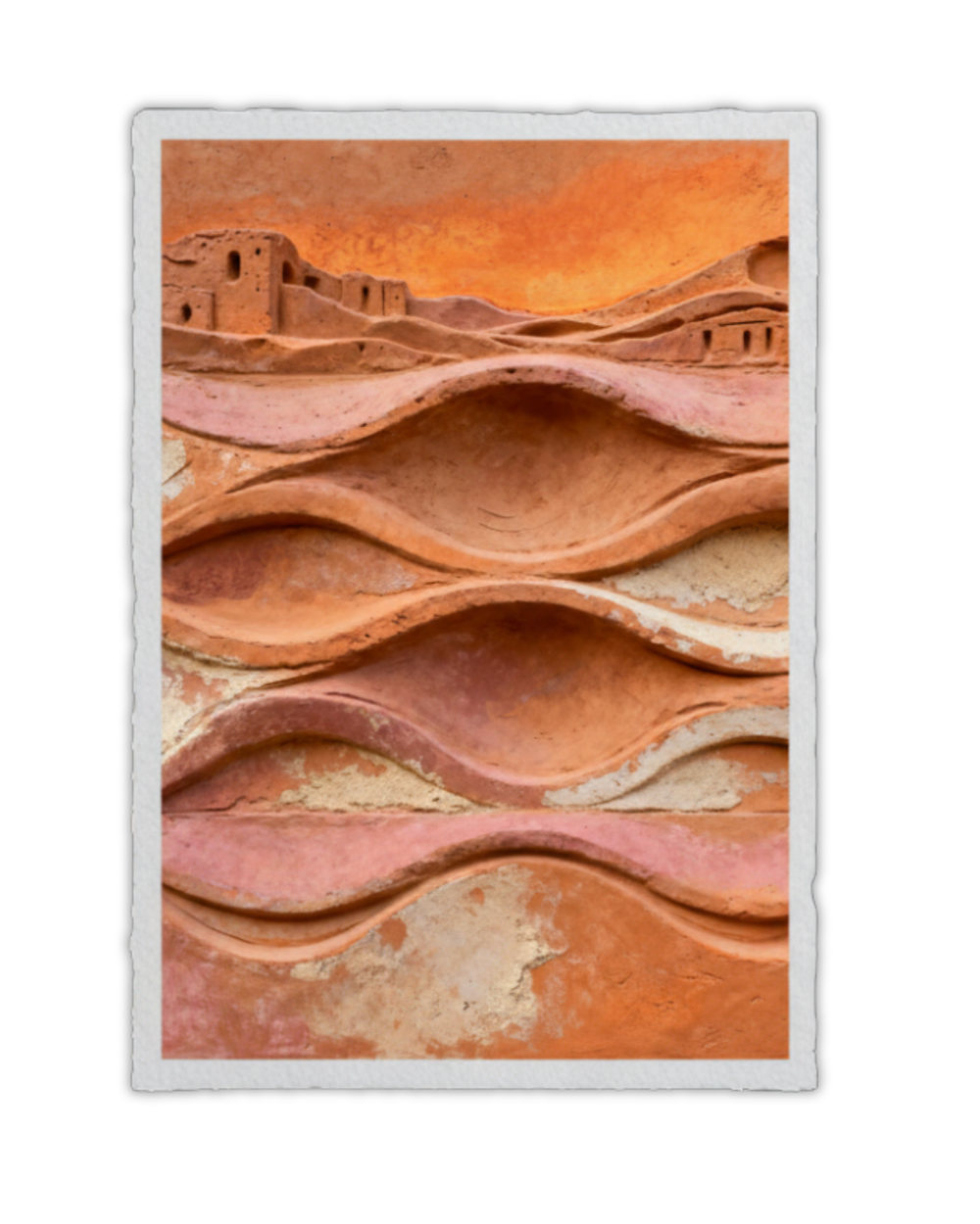 The tones are earthy and grounded, carrying a sense of age and familiarity without feeling dated. Layers of terracotta move softly across the surface, like traces left behind rather than marks freshly made.